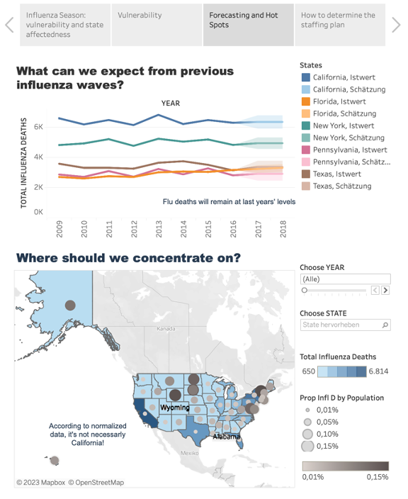 The project helped a medical staffing agency that provides temporary workers to clinics and hospitals on an as-needed basis. The analysis helped plan for influenza season, a time when additional staff are in high demand. The final results examined trends in influenza and how they can be used to proactively plan for staffing needs across the country. Here, I drawed statistical insights from joining two datasets with Excel and finalized an interim report containing the details of the analyses. In a second step, I visualized insights in a Tableau dashboard, which has been used for a final stakeholder presentation.